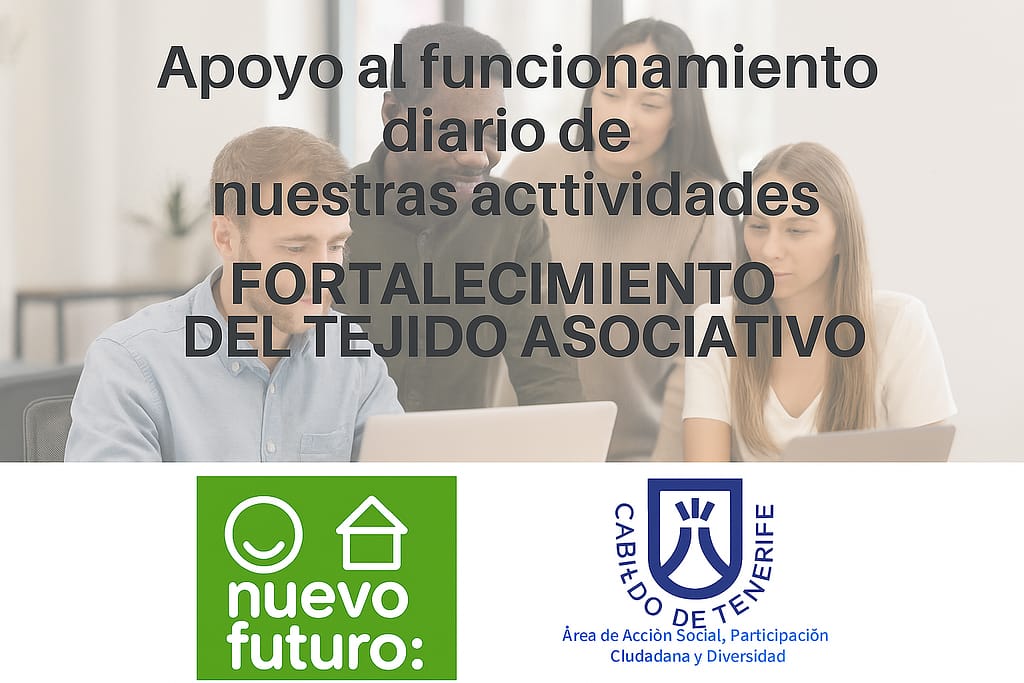 Nuestra entidad ha sido beneficiaria de las subvenciones destinadas al fortalecimiento del tejido asociativo para gastos corrientes (2025). Esta ayuda está destinada a sufragar los gastos derivados de la gestión diaria de nuestra organización, permitiéndonos continuar trabajando en áreas clave como la participación ciudadana, el voluntariado y la defensa de los derechos de las personas vulnerables en la isla de Tenerife.