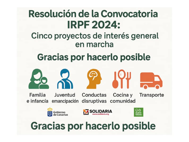 Nos complace comunicar que la Consejería de Bienestar Social, Igualdad, Juventud, Infancia y Familias del Gobierno de Canarias ha resuelto conceder subvenciones a nuestra entidad para la ejecución de cinco proyectos de interés general durante el año 2025.